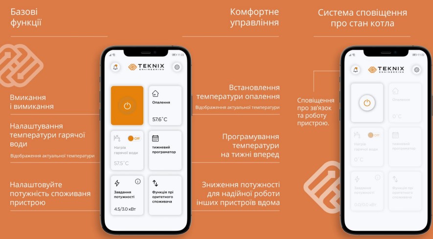 Електричний котел Teknix це сучасний опалювальний котел з чудовим дизайном, який підійде до встановлення у Вашому домі. Модуляція котла зроблена по принципу 6 тенів по 3 кВт, тобто Ви маєте плавний пуск електричної частини з почерговим автоматичним вмиканням кожного тена за допомогою плати керування в автоматичному режимі. Керування електричного котла здійснюється з допомогою Touch-панелі або через мобільний додаток на Вашому смартфоні. Комплектація котла зроблена на самому високому рівні, тут присутні наступні запчастини: Циркуляційний частотний насос Wilo-Yonos PARA розрахований на три режими роботи (країна виробник Німеччина), розширювальний бак CIMM на 6 літрів (країна виробник Італія). Гріючи тени електричного котла Teknix зроблені з нержавіючої сталі, як і сама колба теплообмінника, тени мають авторотацію. Система безпеки котла включає в себе: манометр, датчик температури повітря NTC, датчик температури води NTC, запобіжний термостат, датчик протоку, клапан відведення повітря, запобіжний клапан. Керування котла через інтернет здійснюється за допомогою мобільного додатку TEKNIX Smar boiler. За консультацією або за підбором опалювального пристрою звертайтесь до менеджерів нашого інтернет магазину опалювальної техніки