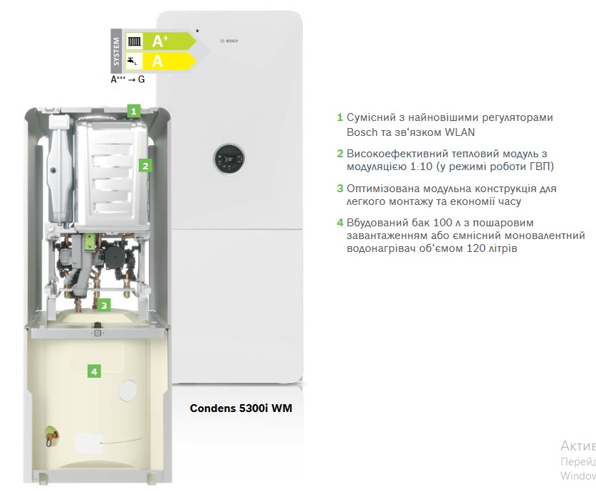 - Kомпактний опалювальний котел потужністю 24 кВт на опалення, 30 кВт для гарячого водопостачання